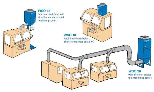 WSO主要優(yōu)點(diǎn)有:1. WSO油霧過(guò)濾器可以滿足各種設(shè)備的安裝要求:可安裝在機(jī)頂、地面或連接中央管道系統(tǒng),如下圖: